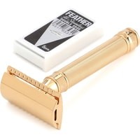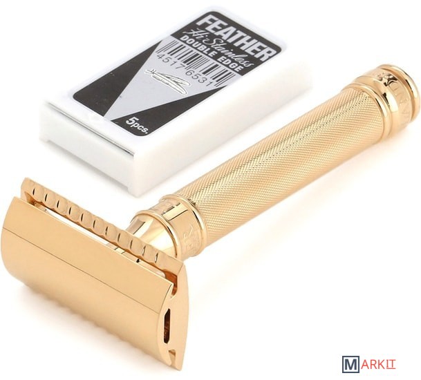 Изысканная бритва на лезвия в золотом цвете. Станок покрыт 23-каратным золотом. Классическая бритва, состоит из трех частей и имеет безопасный закрытый гребень. Предназначена для ежедневного бритья. Устройство очень хорошо сбалансировано. Высота головки бритвы - 25 мм; ширина головки - 41 мм.В комплект входит одно бесплатное лезвие Feather.