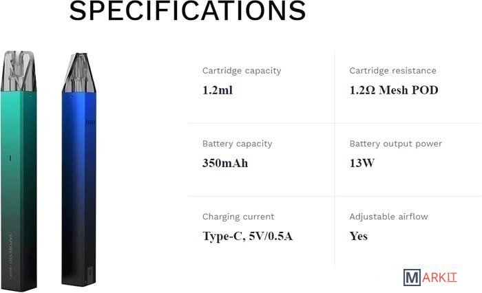 Комплектация - 2 картриджа 1.2 мл- кабель для зарядки- документация